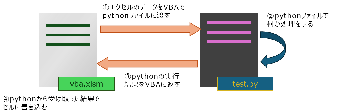 - 上記画像のvba.xlsmとtest.pyは同じフォルダに配置されている