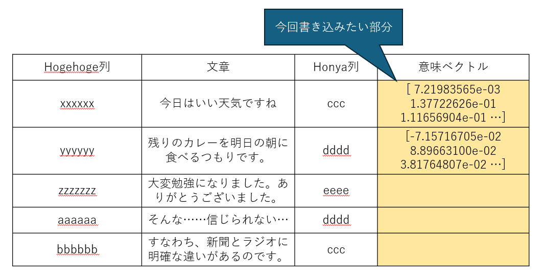 • 変換後の意味ベクトルはCSVファイルの各行の「意味ベクトル」列に書き込む